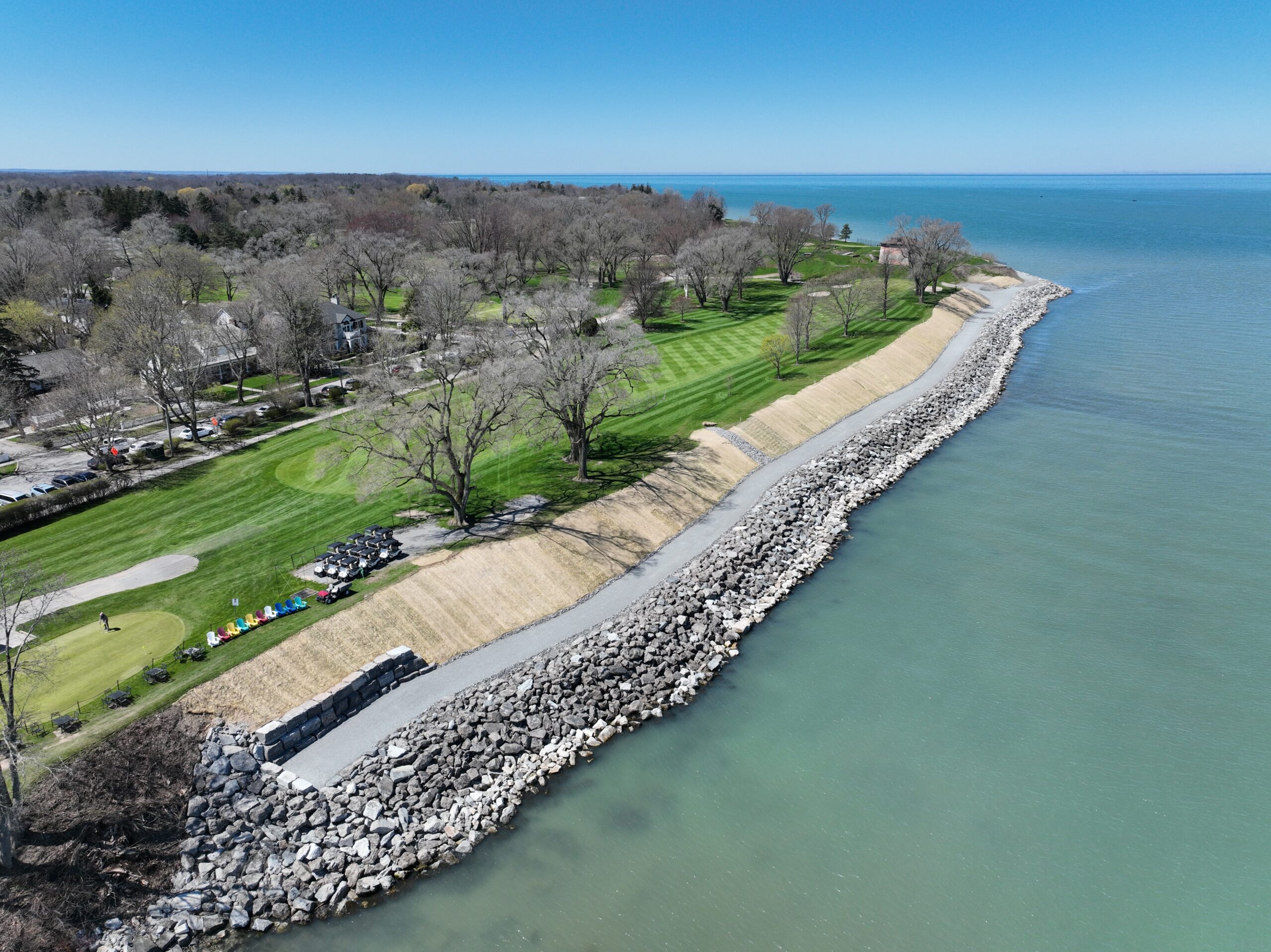 In order to facilitate the scope of work for this project, the following construction activities were completed: creation of access routes, strategically located throughout the Niagara on the Lake Golf Club; re-grading of the existing slope, creating a gradual revetment surface; installation of rip rap and granular bedding material; installation of large toe-stones, and armourstone revetment materials; regrading of the existing top of slope, and creation of a new walking path; and restoration of all site and landscaping areas.