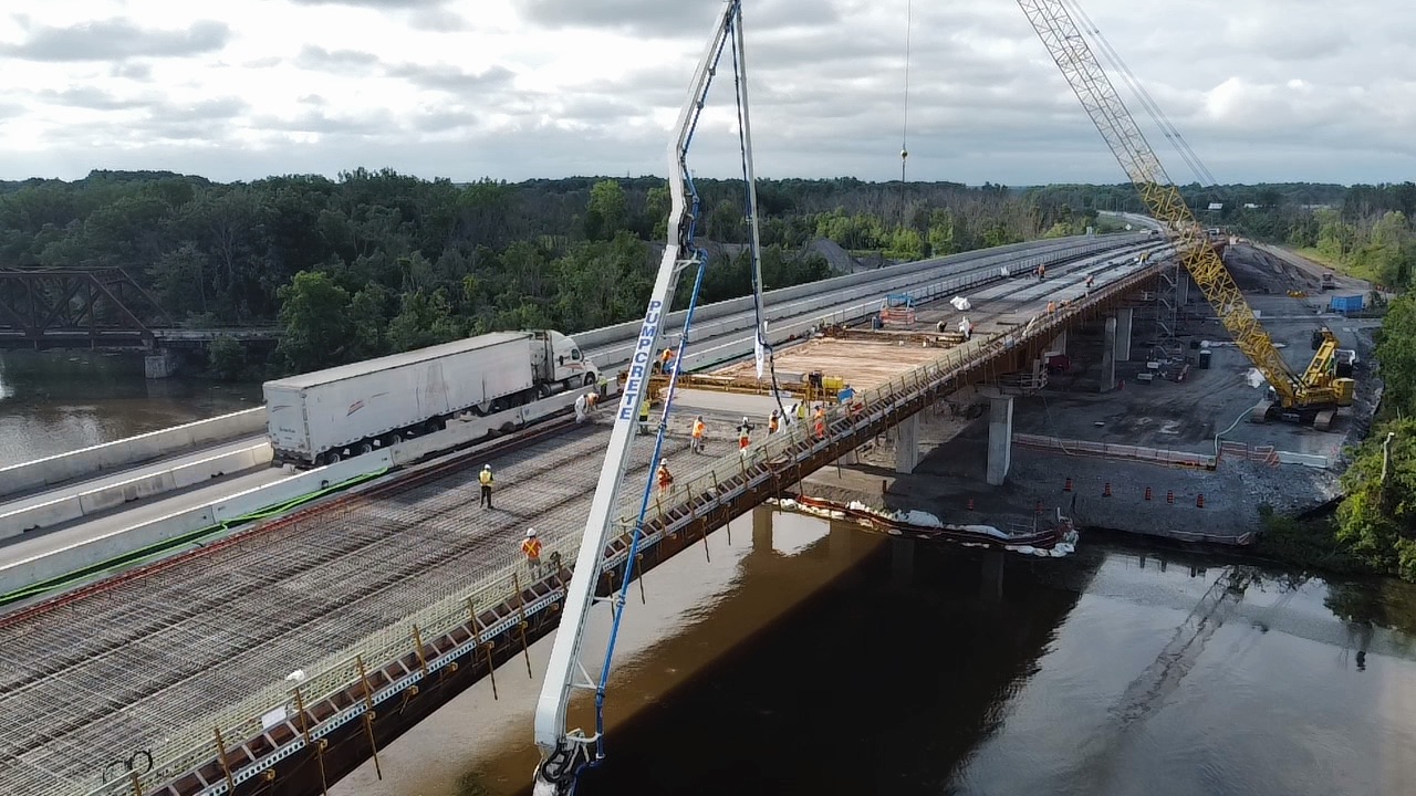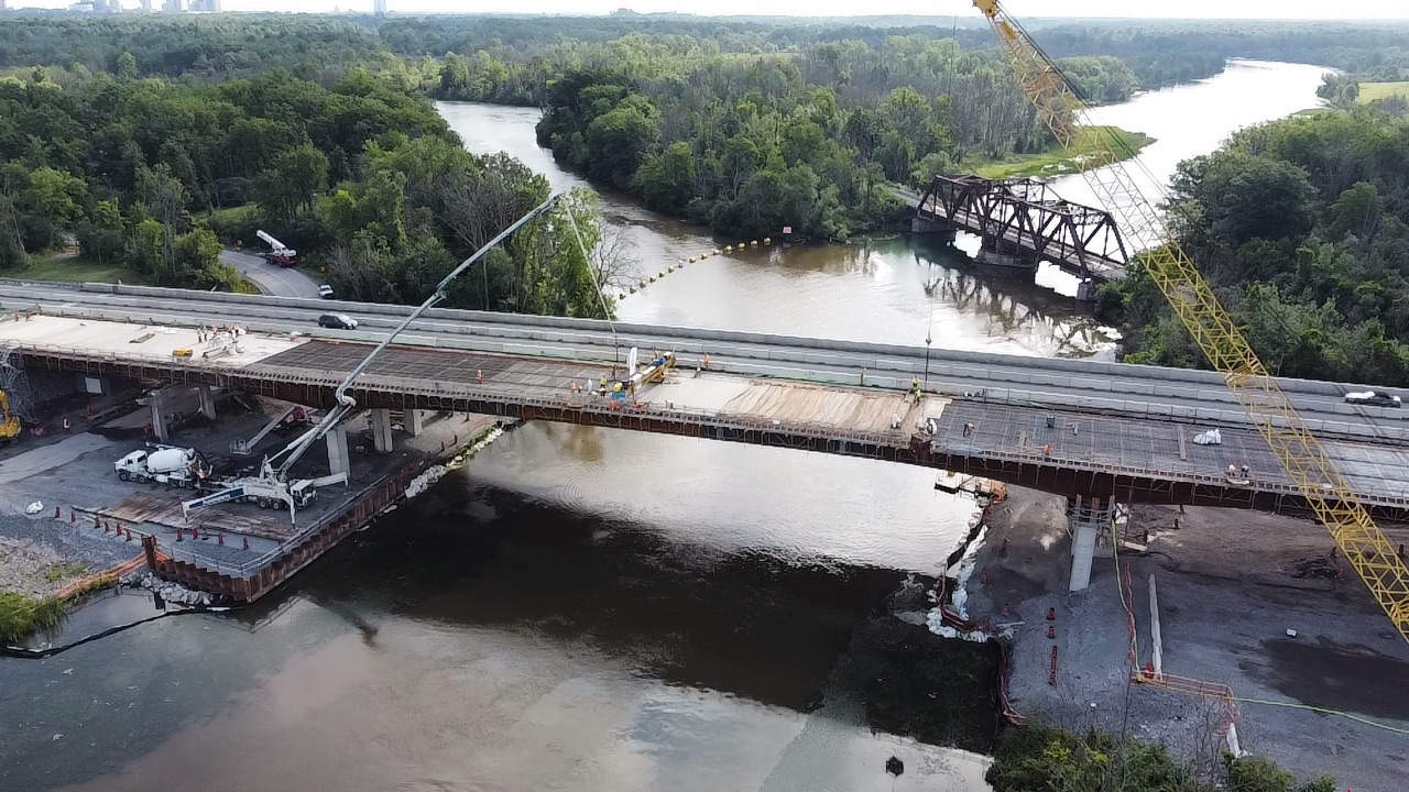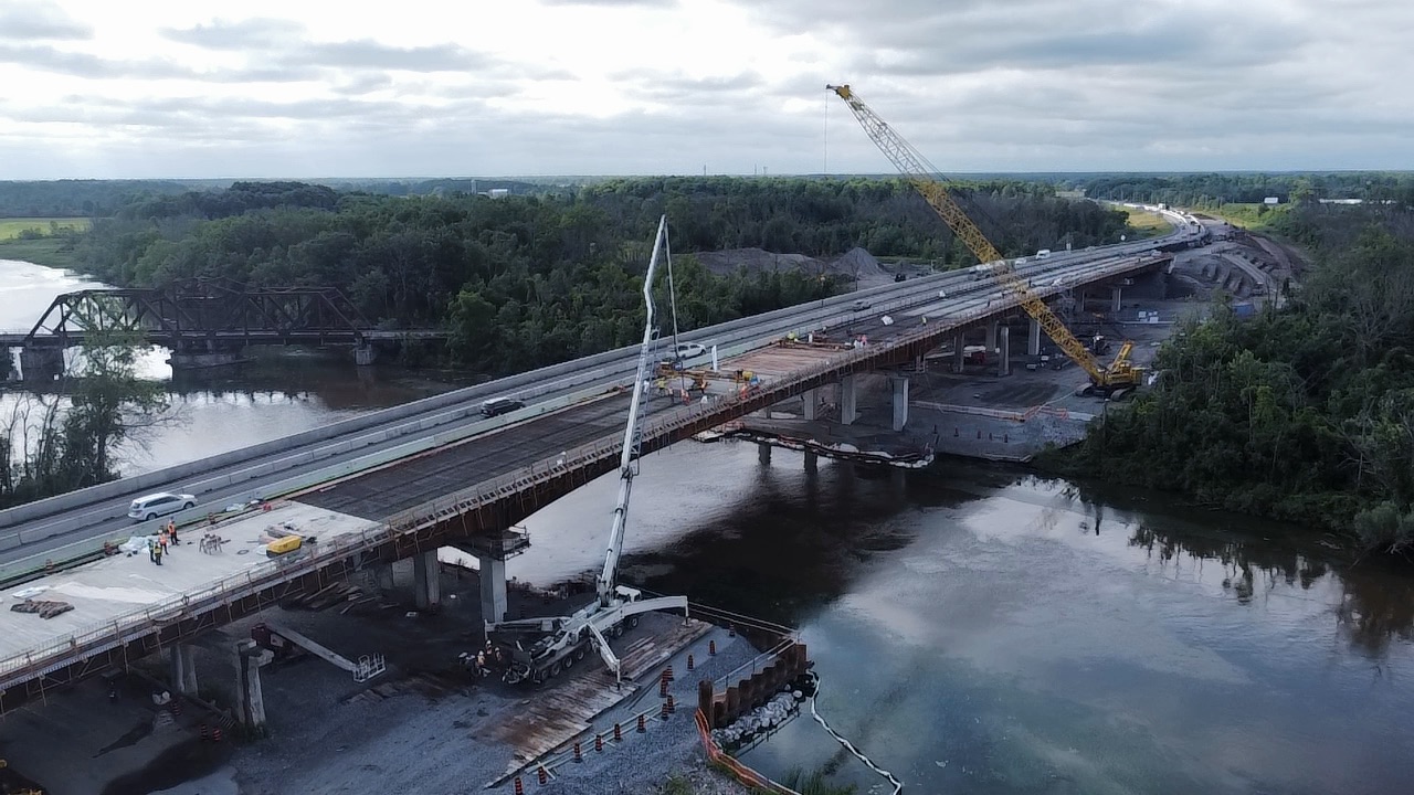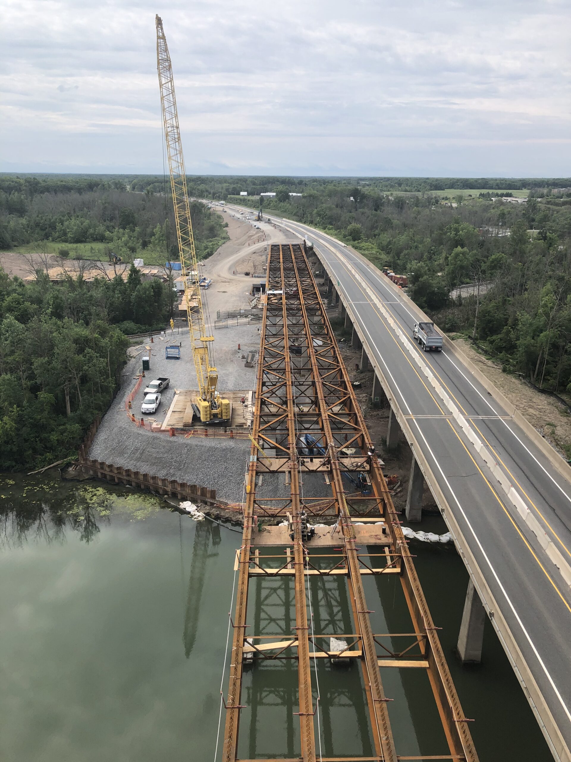 The existing twin highway bridges over the Welland River are being replaced with modern structure.